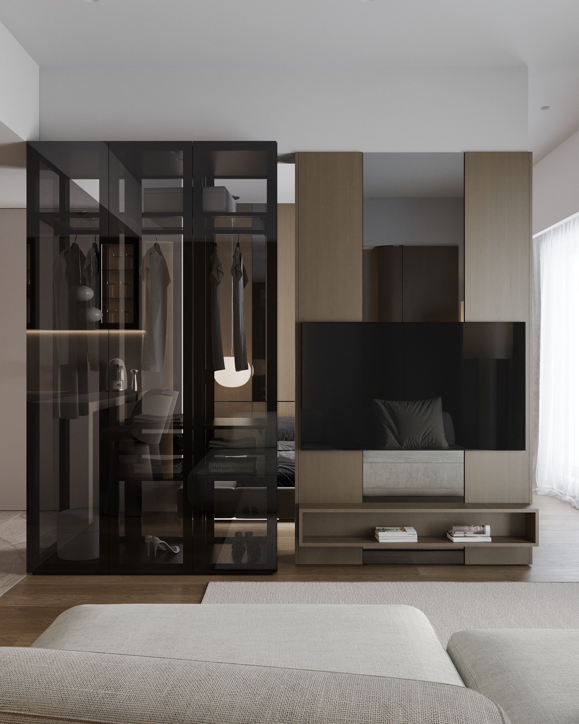 Пространство выполнено единым для комфортного передвижения. Стеклянный шкаф и зона с телевизором отделяют спальню от гостиной, сохраняя при этом полную функциональность. Концептуальные формы и материалы визуально увеличивают общую площадь пространства.